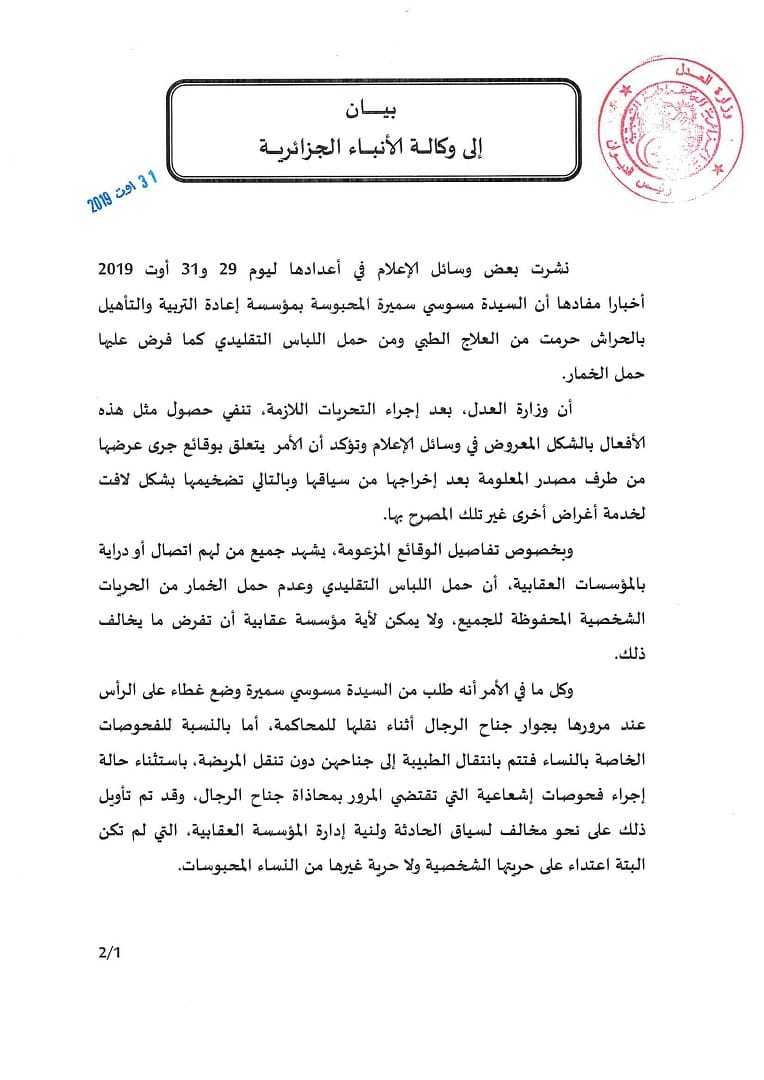 « Tout ce qui a été demandé à madame Samira Messouci c’est de se couvrir la tête durant le passage devant l’aile réservée aux hommes lors de son transfert au tribunal. Concernant les soins, ils sont dispensés par une femme médecin dans l’aile réservée aux détenues. Ces dernières n’ont pas besoin de se déplacer pour recevoir les soins hormis pour les examens radiologiques qui nécessitent un passage à proximité de l’aile réservée aux détenus », détaille le ministère.