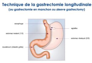 La Sleeve gastrectomie consiste à retirer environ les deux tiers de l’estomac. L’organe prend ensuite la forme d’un tube étroit. D’où le terme anglais sleeve (« manche »).